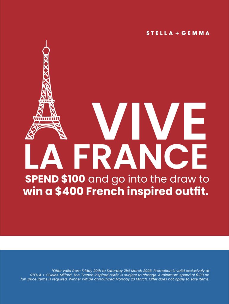 In honour of Vive La France, Stella + Gemma is bringing a little Parisian flair to Milford. Spend $100 in store from Friday and go in the draw to win a $400 French inspired outfit.