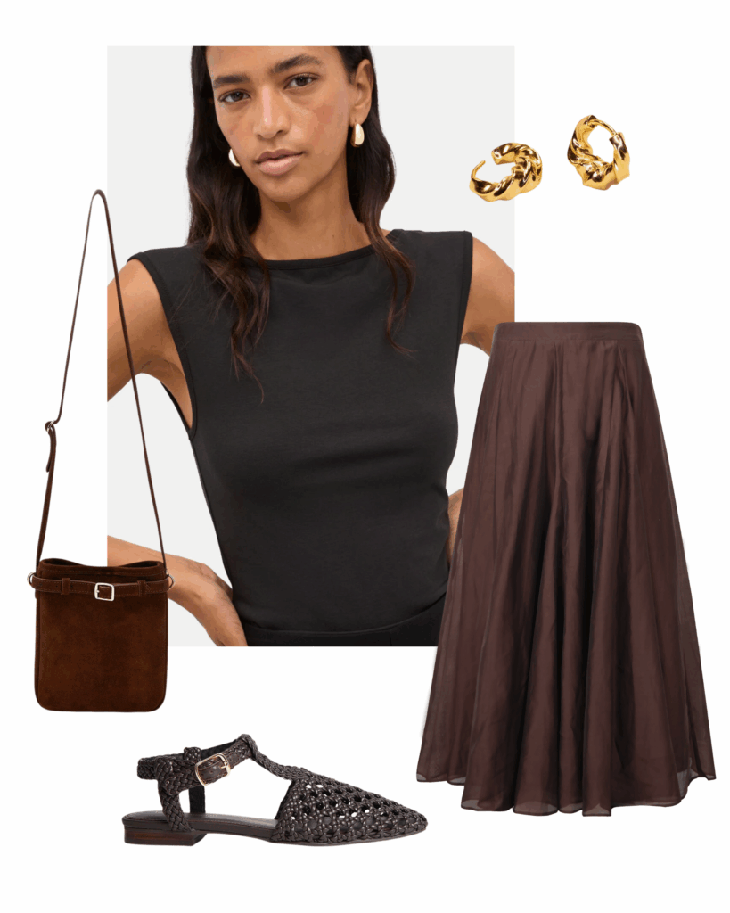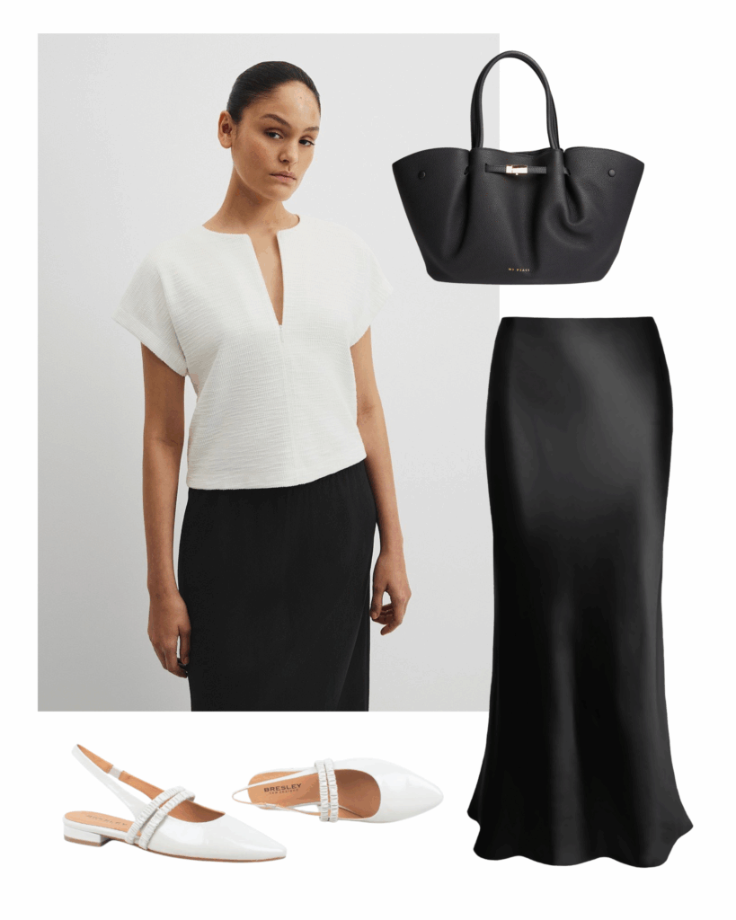Styling is deliberate yet restrained, with smooth finishes, a neutral palette, and unfussy accessories that keep the focus on proportion and polish. Structured tops paired with flowing skirts or satin pieces create balance, maintaining a clean, confident silhouette without leaning too relaxed. Neutral tones such as black, white, and cream reinforce the crisp, modern aesthetic, while lightweight layers add subtle sophistication. The overall effect is effortless yet sharp and quietly authoritative.