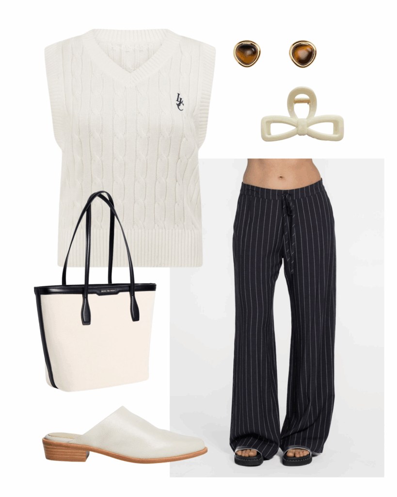 Pictured: Lorna Jane Cable Knit Vest, Country Road Arya Mini Stud, Stella + Gemma Large Bow Hair Claw, Repertoire Solene Wide Leg Stripe Pant, Flo & Frankie Natural Canvas Black Trim Tote, Merchant 1948 Wanda Mule