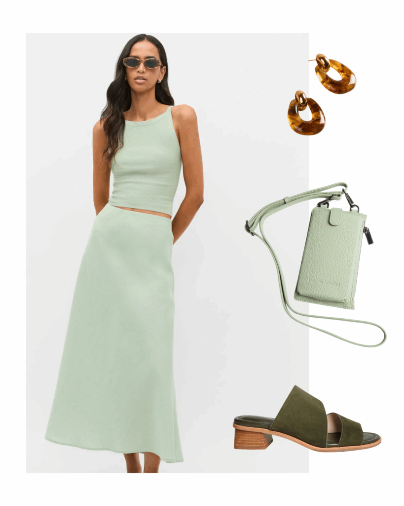 Pictured: Seed Heritage Cotton Blend Knit Top & Linen Minimalist Skirt, Blue Illusion Knocker Earrings, Merchant 1948 Marisia Phone Case, Merchant 1948 Esta Sandal